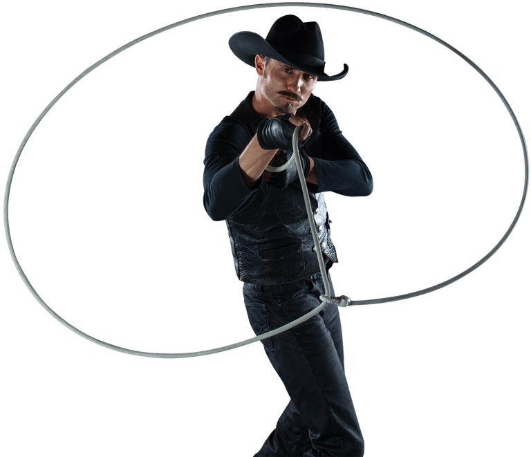 His act of trick roping, whip cracking, and fancy gun spinning has thrilled thousands of audiences.